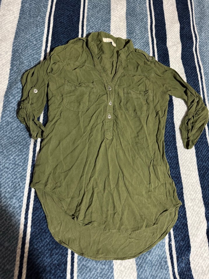 Kadın haki renk keten kumaştan, düğmeli uzun kollu, yakalı ve salaş kesime sahip midi uzunluğunda gömlek. Rahat ve gündelik kullanım için uygundur.