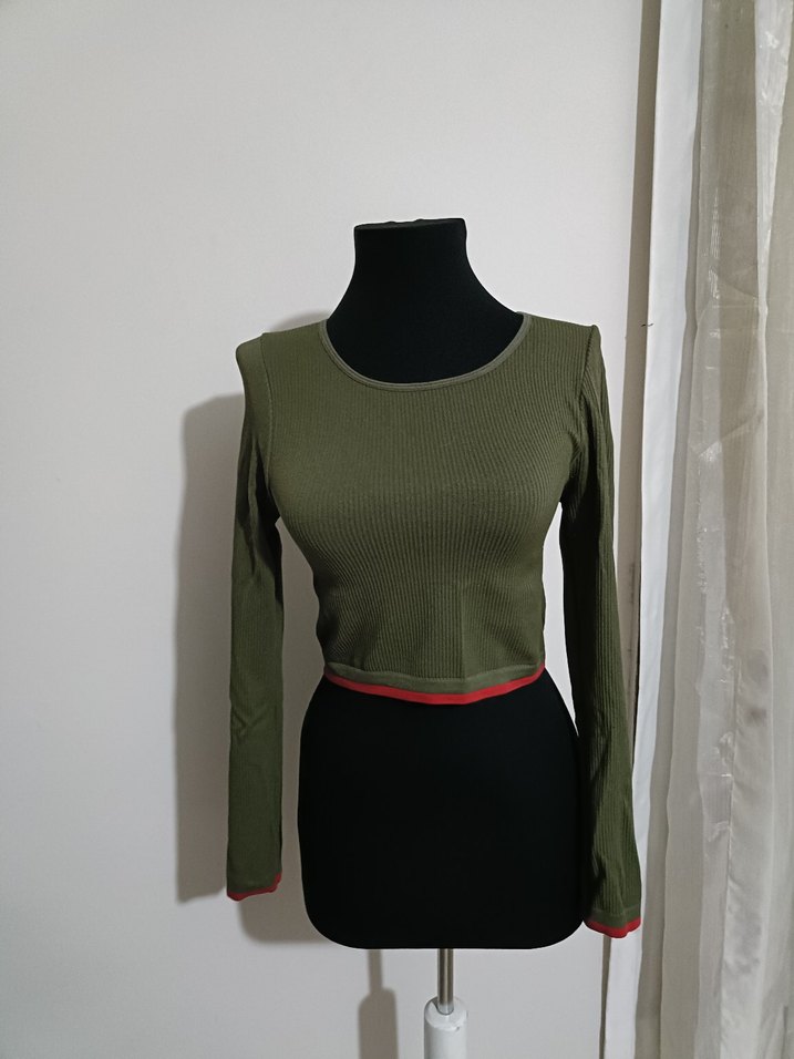 Kadınlar için uzun kollu, yuvarlak yaka ve fit kesime sahip koyu haki kısa kazak. Sentetik yumuşak kumaştan, minimalist ve sade tasarım, kırmızı detaylarla şık görünüm sunar.
