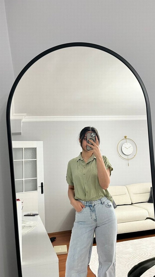 Kadın haki renkli denim gömlek, kısa kollu ve yakalı tasarımıyla rahat ve salaş bir görünüm sunar. Günlük kullanıma uygun pastel tonlarıyla şık ve rahat bir tercih.