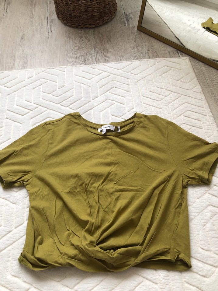 Kadın haki renk kısa kollu keten tişört, yuvarlak yaka ve bol kesim. Önde bükümlü detayla rahat ve şık bir görünüm sunar temiz kusursuz
