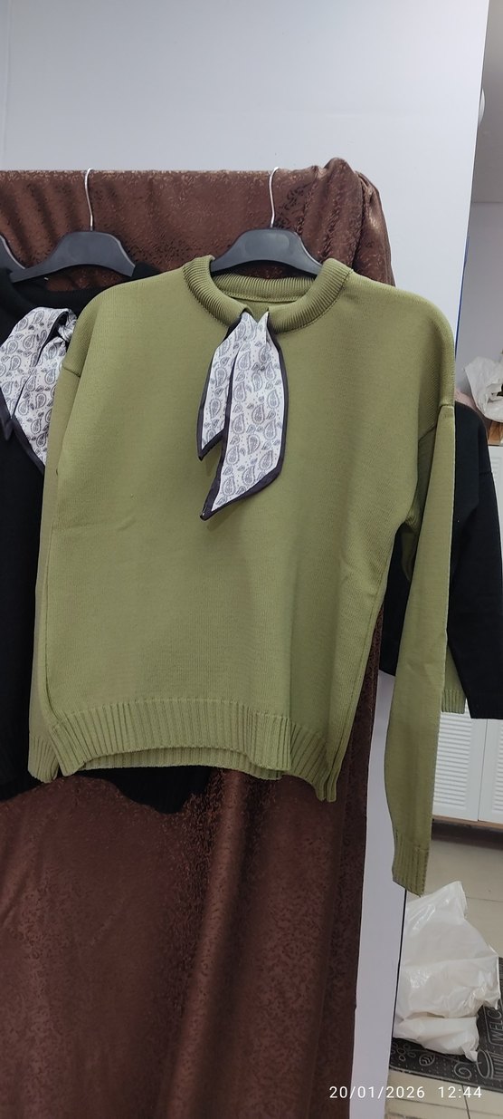 Kadınlar için haki renkli, kısa kesim, yuvarlak yaka ve uzun kollu triko kazak. Rahat kesimiyle günlük ve sokak stiline uygun, örme kumaştan yapılmıştır.