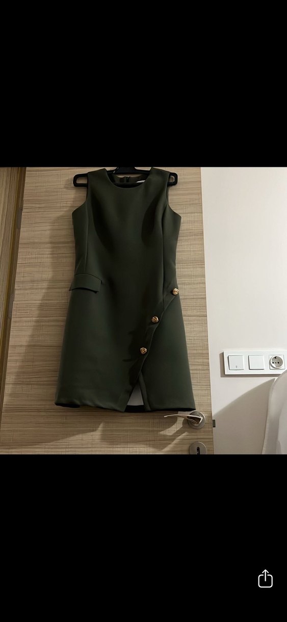 Kadın haki renginde, kolsuz ve kısa mini takım elbise. Düğmeli ön detayları ve kesimli yakasıyla minimalist ve şık bir görünüm sunar. Günlük kullanıma uygundur.