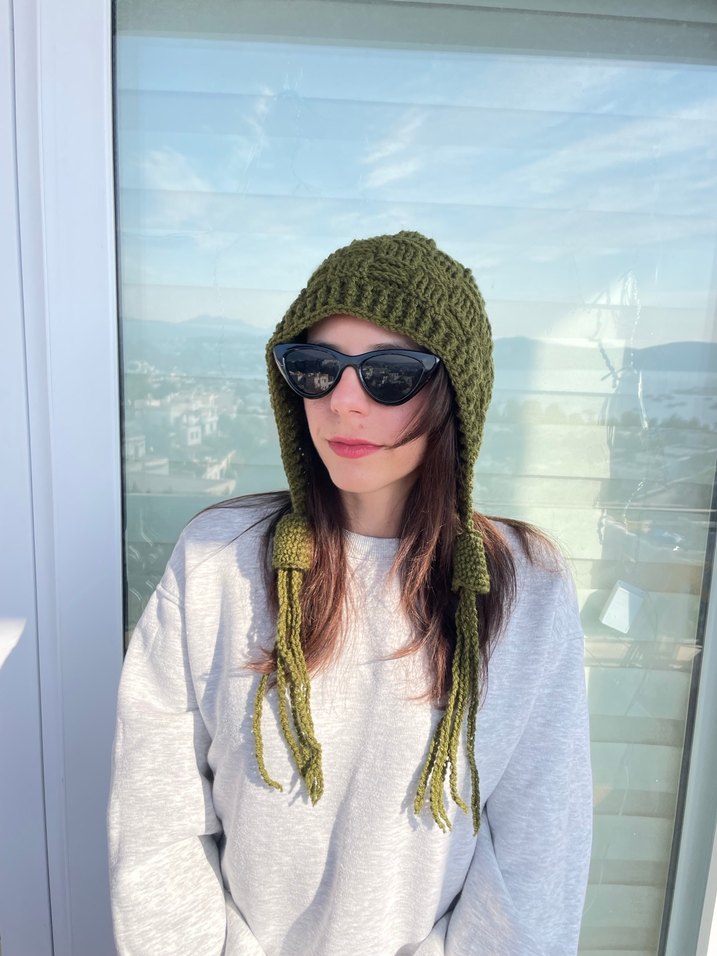 Kadınlar için haki renkli, örgü dokulu bere, uzun örgülü püskülleriyle bohem ve retro tarzı yansıtıyor. Rahat ve özgün bir görünüm sunar.