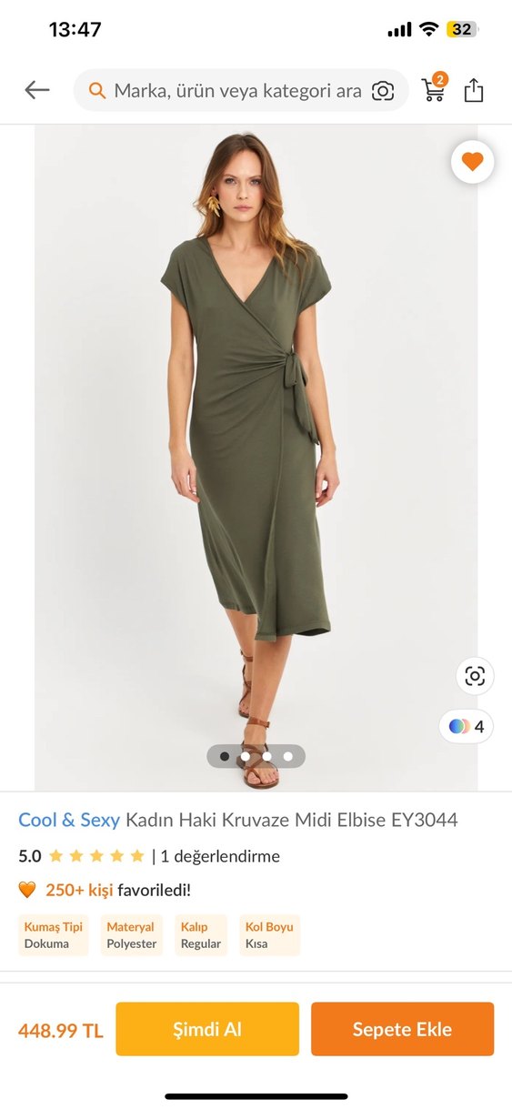 Haki renkte, kruvaze kesim, v yaka ve askılı kollara sahip, ince ve satenimsi kumaştan yapılmış midi elbise. Modern ve şık görünüm sunar.