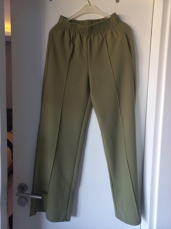 Kadınlar için haki renkli, regular fit kumaş pantolon. , elastik bel bantlı, sade ve şık athleisure tarzda günlük kullanım için uygun M beden36 38 uyumlu hic kullanilmadi zara degildir butik urunu