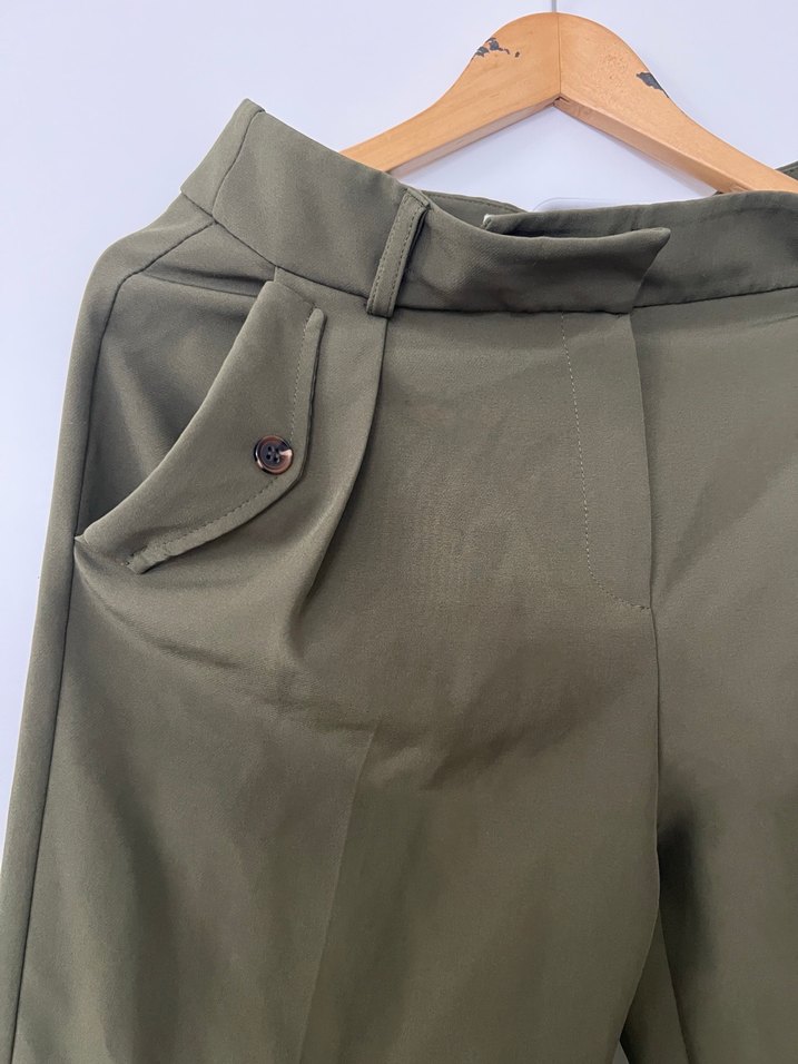 Kemerli, normal boy, haki renkte kadın kumaş pantolon. Parlak görünümlü, sentetik kumaştan üretilmiş, ofis için uygun. ✨