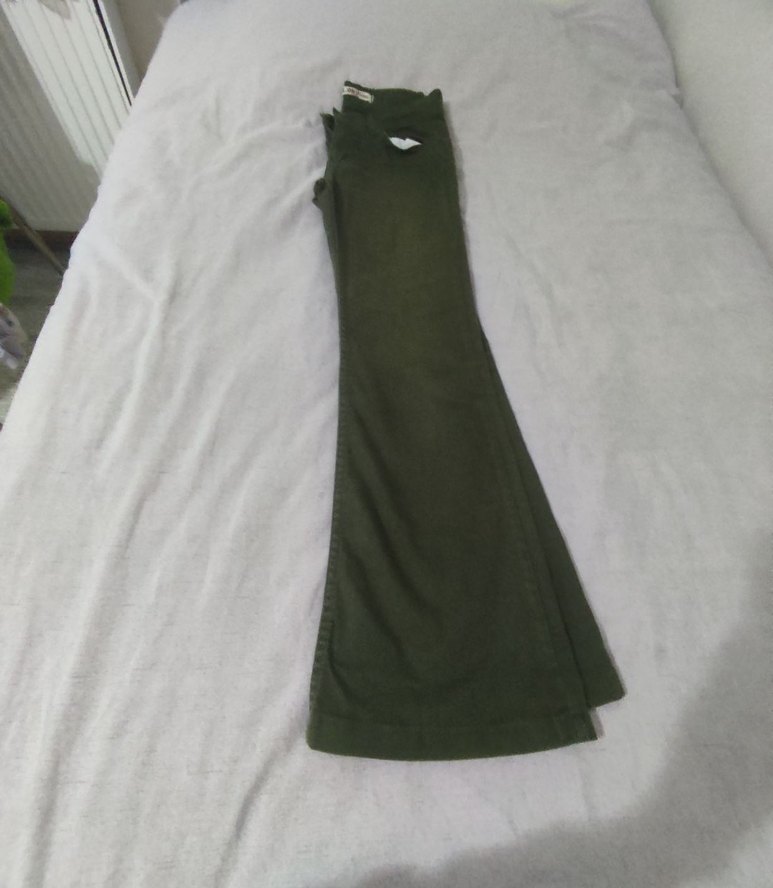 Kadınlar için koyu yeşil kumaş pantolon, dar kesim ve kemerli. Sentetik kumaştan üretilmiş, gündelik rahat normcore tarzına uygundur.90cm boy,70cm bel