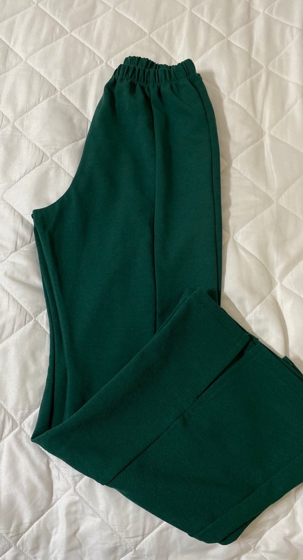 Koyu yeşil kadın kumaş pantolon, normal kesim ve midi boy. Yumuşak sentetik kumaştan üretilmiş, gündelik kullanım için rahat ve şık.