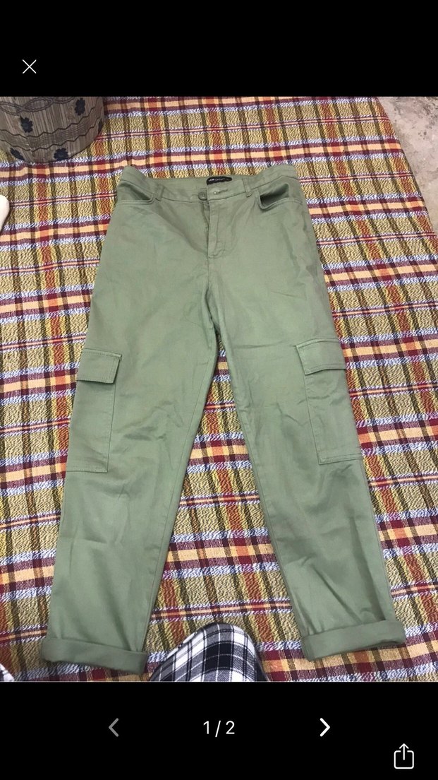 Kadın haki pamuklu kumaş pantolon, kemerli bel ve midi boy ile rahat ve şık günlük kullanım için uygundur.