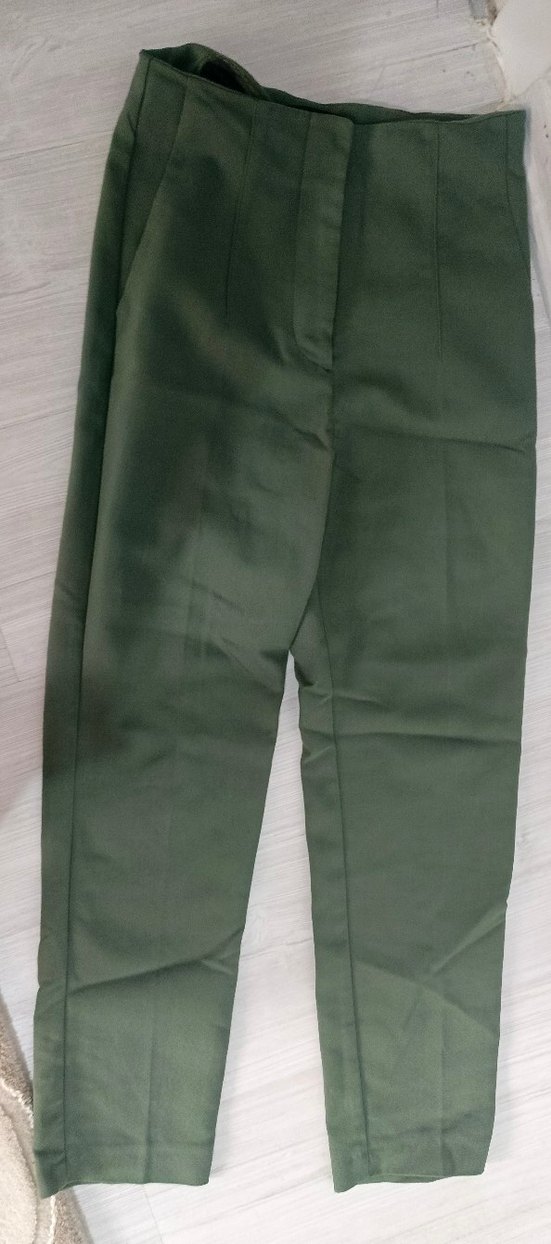 Kadın haki renk, parlak yüzeyli kumaş pantolon. Regular fit ve midi boy, minimal ve normcore tarzda, ofis için uygun. ✨