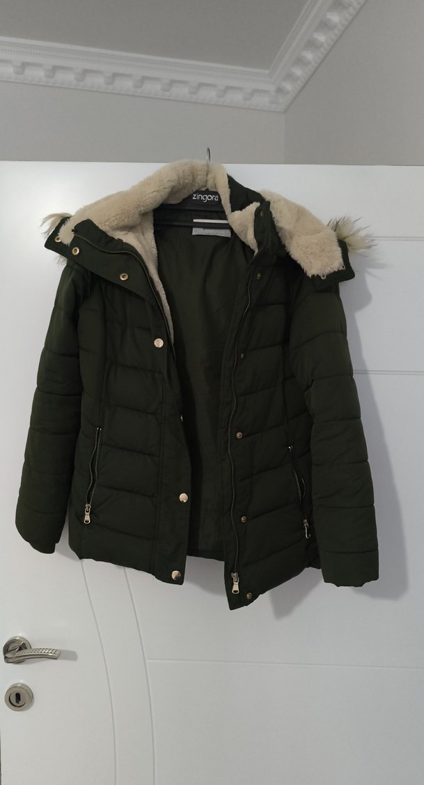 Kadınlar için haki renk, kürklü detaylı, normal boy, yumuşak ve sıcak kumaştan yapılmış, notched lapel yakalı, günlük kullanıma uygun, dar kesim kışlık mont.