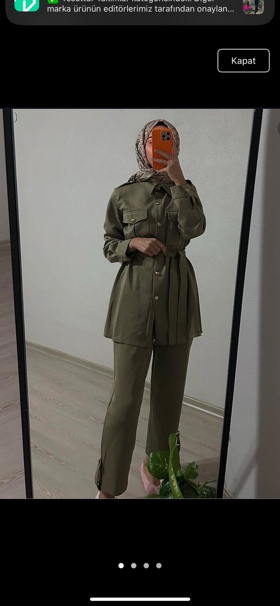 Kadınlar için haki renkli, kuşaklı uzun ceket ve düz kesim pantolondan oluşan takım. Notch yaka ve uzun kollu, rahat sentetik kumaştan üretilmiştir.