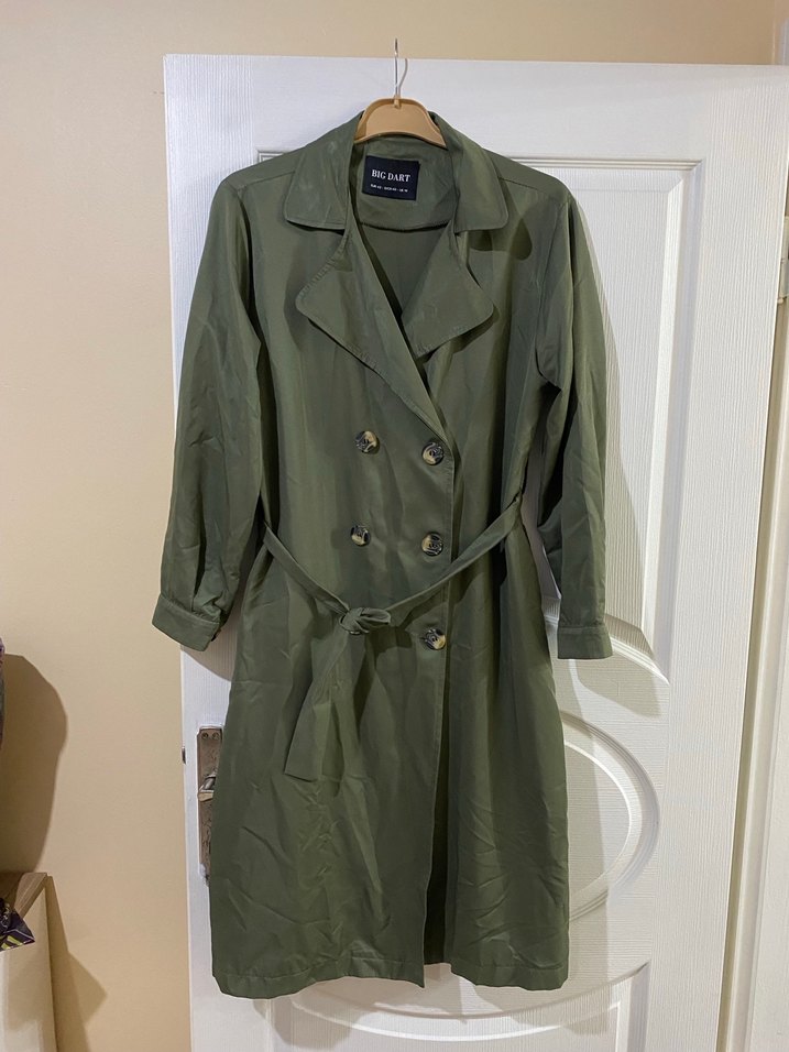 Kadın haki renkli, kuşaklı ve uzun kollu trençkot. Gevşek kesim ve yakalı, parlak kamuflaj desenlidir. Günlük sokak tarzına uygundur.