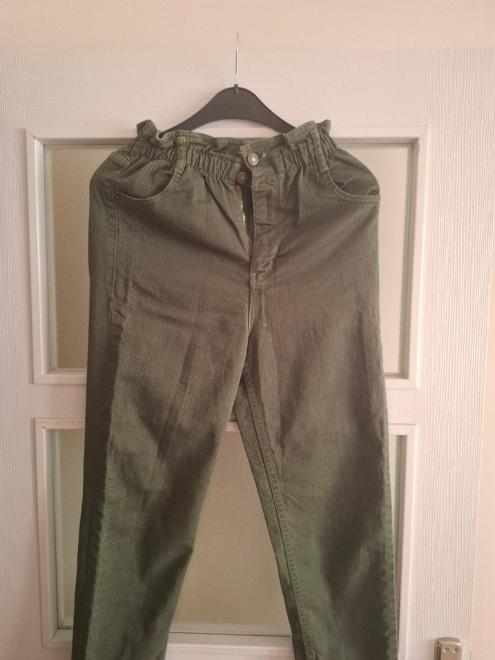 Kadınlar için pamuklu kumaştan yapılmış, bol kesim ve düğmeli ön kısmı olan haki pantolon. Günlük rahat kullanım için uygundur, desensiz ve sade tasarımlıdır.