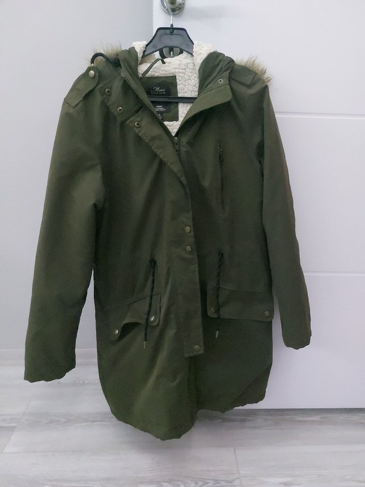 Kadınlar için tasarlanmış, düğmeli önü ve kesik yaka detaylı, bol kesim haki renk midi ceket. Sentetik kumaştan, uzun kollu ve dış mekan kullanımı için uygun.