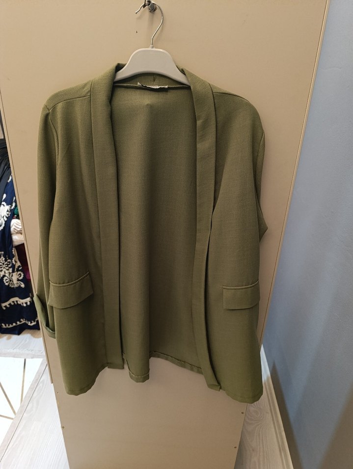 haki renkli, normal uzunlukta midi blazer ceket. Notlu yaka, uzun kollu ve düz desensiz tasarıma sahip, rahat kesimle günlük şıklık sunar. çok az kullanıldı bana olmadığı için satıyorum.