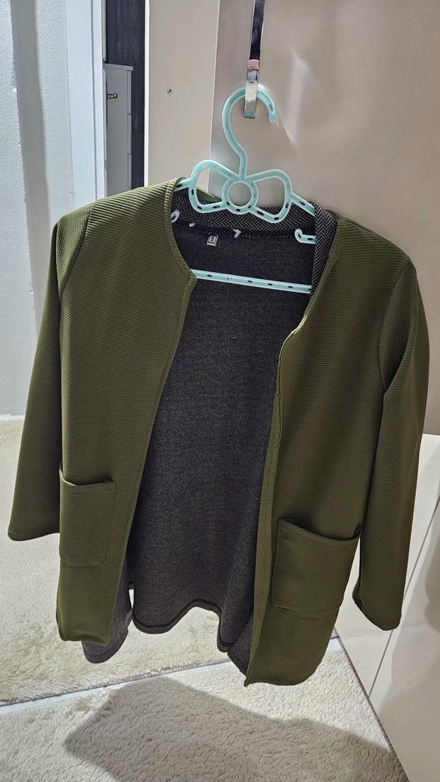 Kadınlar için haki renkte, düğmeli, cep detaylı, midi boy, uzun kollu, bol kesim ceket. Yumuşak sentetik kumaştan, günlük kullanım için uygun.