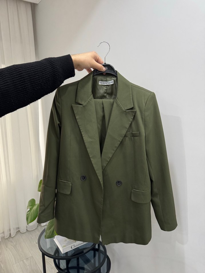 Kadın haki midi ceket, notched yaka, düğmeli ve uzun kolludur. Normal kesim ve sentetik kumaştan olup ofis ve günlük kullanıma uygundur.