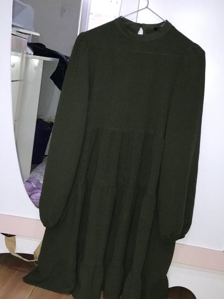 Kadın haki renk midi boy, yüksek yakalı, uzun kollu, bol kesim, pileli elbisedir. Yumuşak sentetik kumaştan üretilmiştir, günlük kullanıma uygundur.