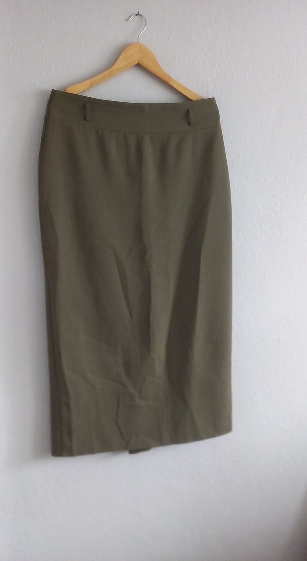 Kadın haki midi kalem etek, rahat kesim ve ipeksi kumaşla minimal ve normcore tarzını yansıtır. Ofis için uygun, desensiz ve sade tasarım. bel 86 uzunluğu 94
