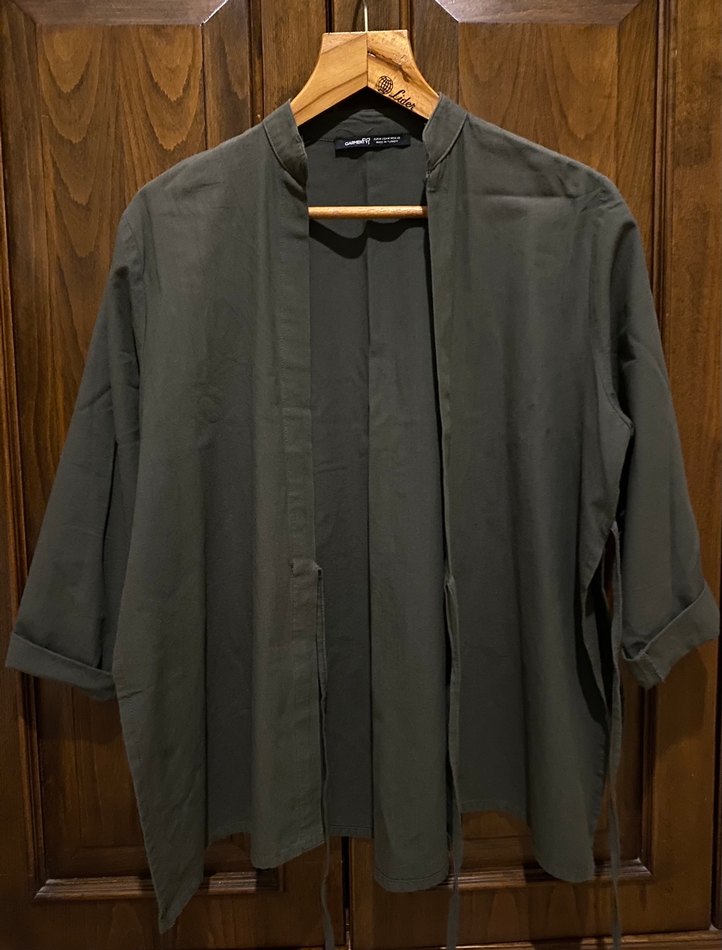 Kadın keten kumaştan, haki renkte, uzun kollu, notched lapel yakalı, midi boyda, rahat kesim ve desensiz gömlek. Ofis ve günlük kullanım için uygun, şık ve rahat bir parça.