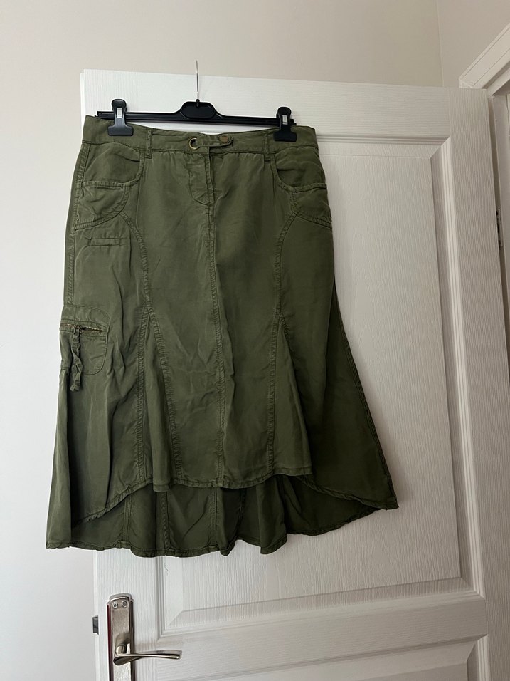Kadın haki midi uzunlukta, keten kumaştan, bol kesim ve pilili tasarıma sahip etek, günlük kullanıma uygundur.