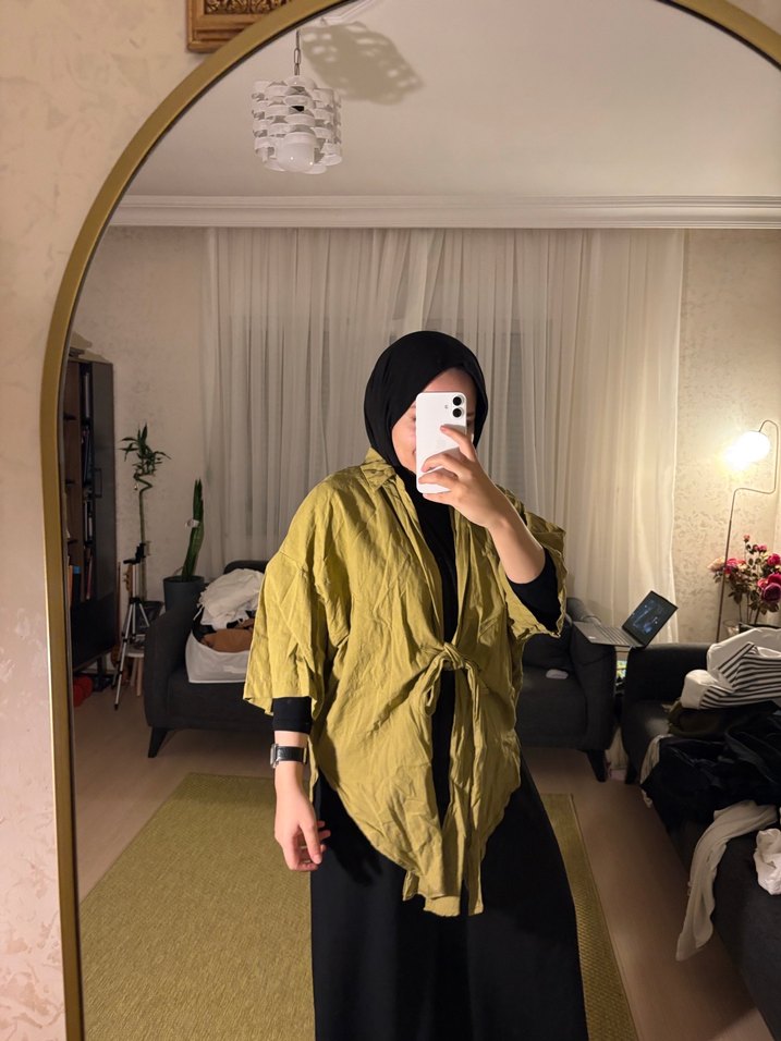 Kadınlar için haki renk, keten kumaştan, salaş kesim midi kimono. Drapeli tasarım, uzun kollu ve boğazlı yaka detaylıdır. Minimalist, trend günlük stil için uygundur.