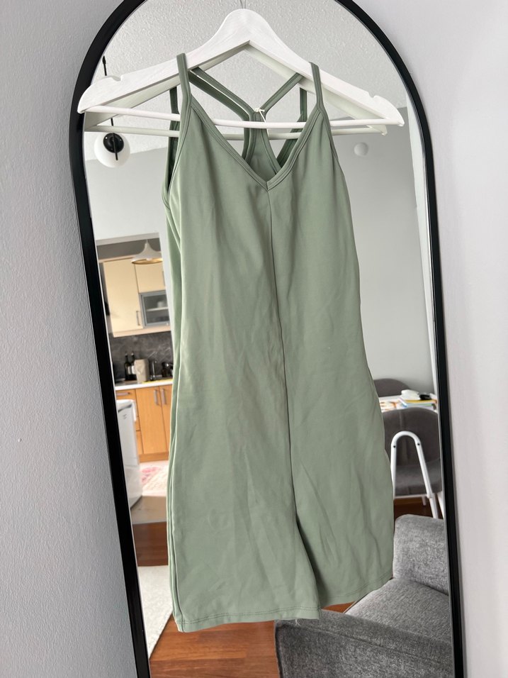 Kadınlar için fitted kesim, kolsuz ve V yakalı midi uzunlukta tulum. Sentetik kumaştan, haki renkte, streetwear tarzında spor şıklık sunar.