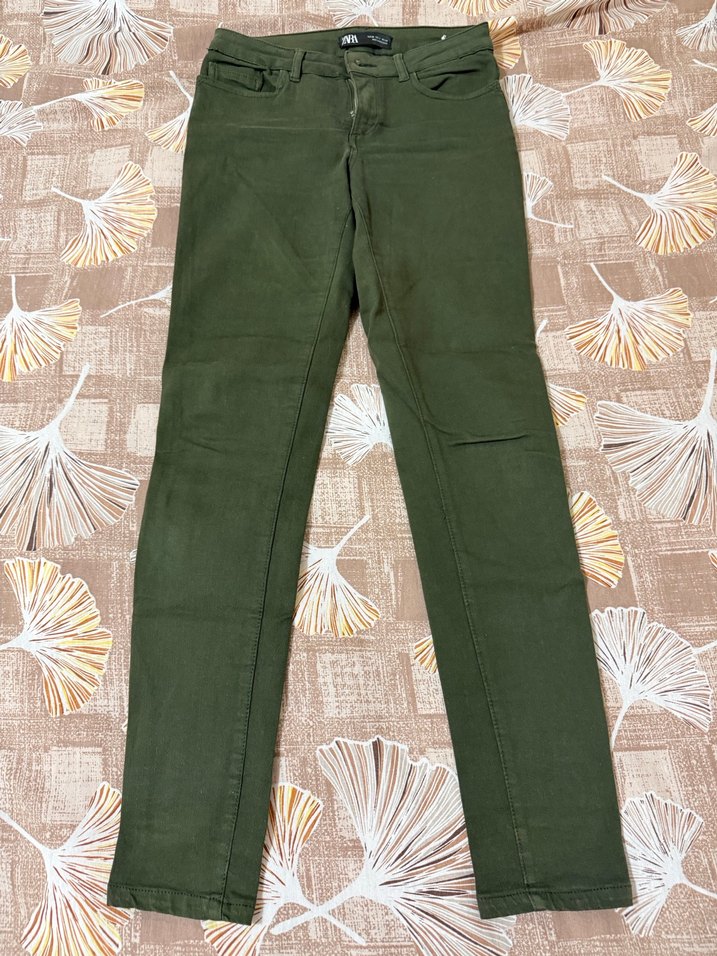Kadın haki renk midi uzunlukta, regular fit kumaş pantolon. Yumuşak sentetik kumaştan, günlük rahat şıklık için ideal.