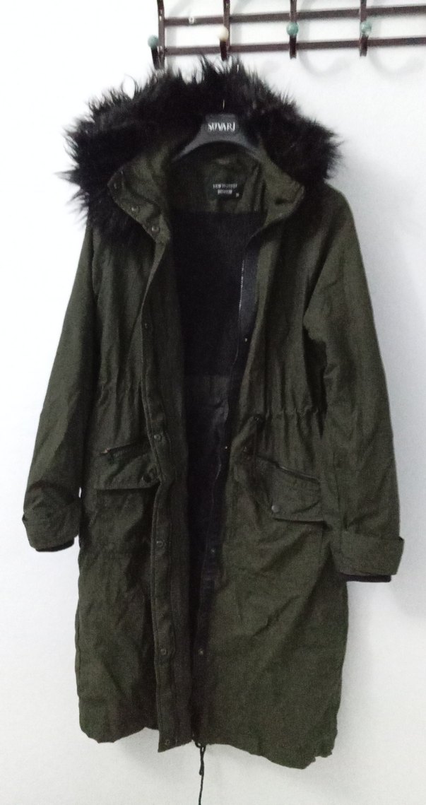 Kadın haki rengi, uzun kollu, cep detaylı ve kürklü kapüşonlu midi mont. Rahat kesimli ve sıcak tutan kumaştan üretilmiştir.