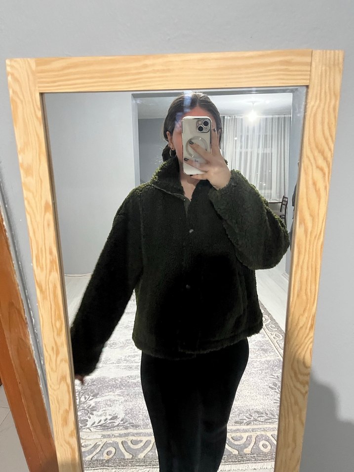 Kadınlar için haki renkli, midi boy, bol kesim ve yüksek yakalı kışlık mont. Yumuşak, sıcak tutan kumaştan, uzun kollu ve puff detaylıdır.