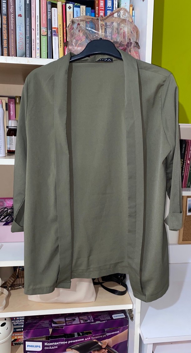 Kadın ceket, haki renkte, notched lapel yakalı ve uzun kolludur. Rahat kesim ve dökümlü tasarıma sahiptir. Ofis için uygundur.