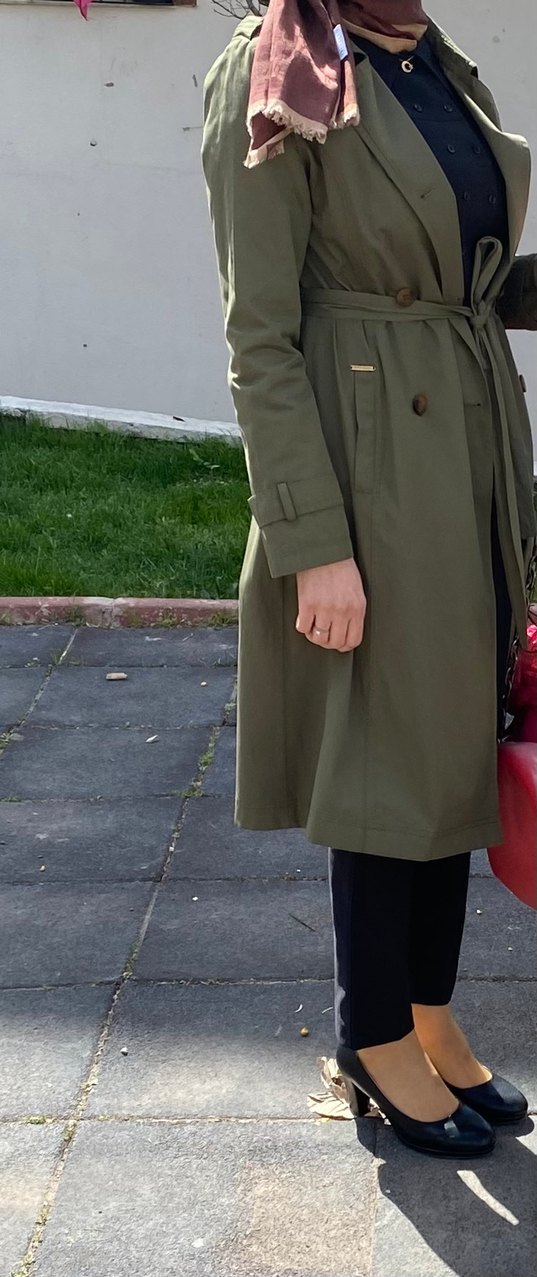 Uzun kollu, yakalı ve kuşaklı, bol kesim haki süet trençkot. Midi boy, sokak tarzına uygun. Markası setrms