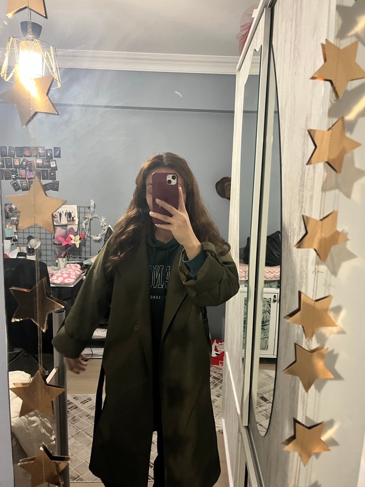 Kadınlar için bol kesim, uzun kollu, haki midi trençkot. Şeffaf detaylı, yumuşak ve sıcak kumaştan, günlük kullanıma uygun. 44 beden