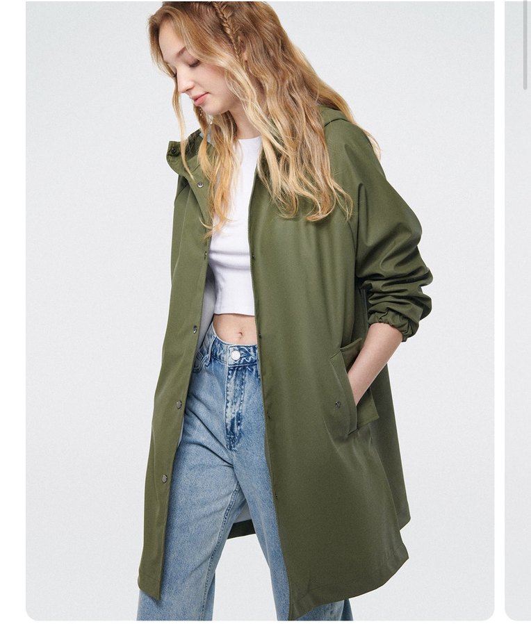 Kadın haki midi trençkot, uzun kollu, yuvarlak yakalı ve bol kesimdir. Parlak sentetik kumaştan yapılmış, günlük rahat kullanıma uygundur. Bir iki kez giyindim. Hiç su geçirmez. Bana biraz bol geliyor S -M bedene çok rahat olur