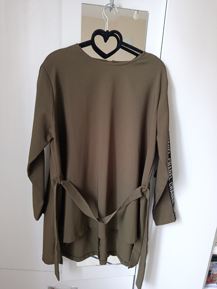 Kadın asker yeşili tonlarında, uzun kollu, kuşaklı midi tunik. Rahat kesimli ve yuvarlak yaka. 2 kez belki giyilmiştir. Sorunu yok sıfır gibi. 42 beden 46ya kadar olur.