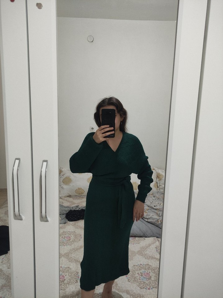 Haki midi elbise, uzun kollu ve yüksek yakalıdır. Rahat ve bol kesimiyle sıcak ve konforlu bir kullanım sunar. Günlük kullanıma uygundur.