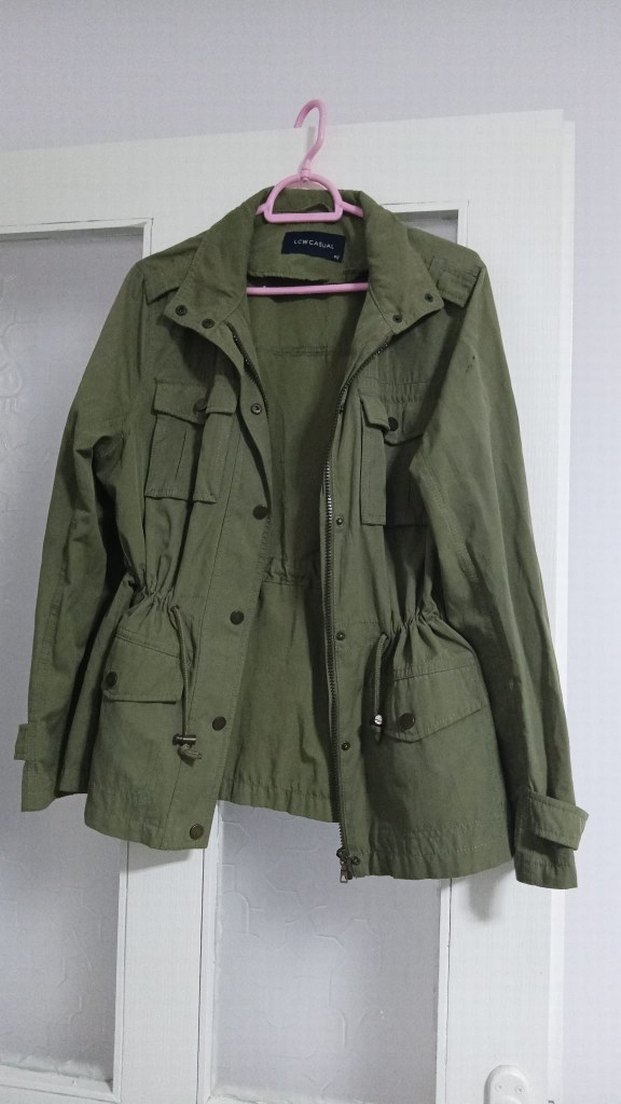 Haki renkli, midi uzunlukta kadın ceket, düğmeli ve bol kesim. Keten kumaştan, uzun kollu ve kesik yaka detayıyla günlük rahat tarz için uygundur. iki kol arası 54 boy 64