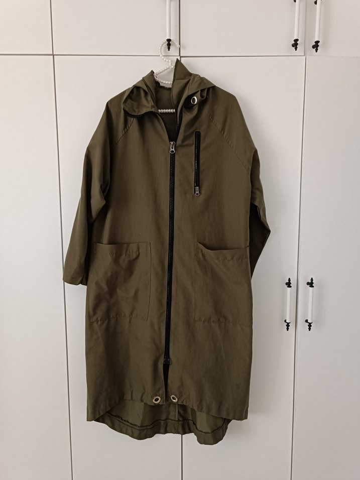 Koyu haki renk midi boy, bol kesim yağmurluk. Uzun kollu, çentikli yaka ve fermuarlı kapama ile iki büyük ön cep bulunur. Sentetik kumaştan günlük kullanıma uygun. ☔arkası malesef dolaba sıkışmış farketmedim izi var
