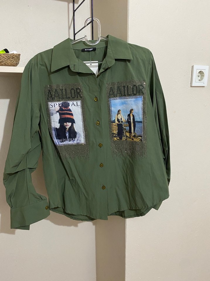 Uzun kollu, düğmeli, baskılı görsellerle süslenmiş haki renk bol kesim mini gömlek. Günlük rahat kullanıma uygundur.