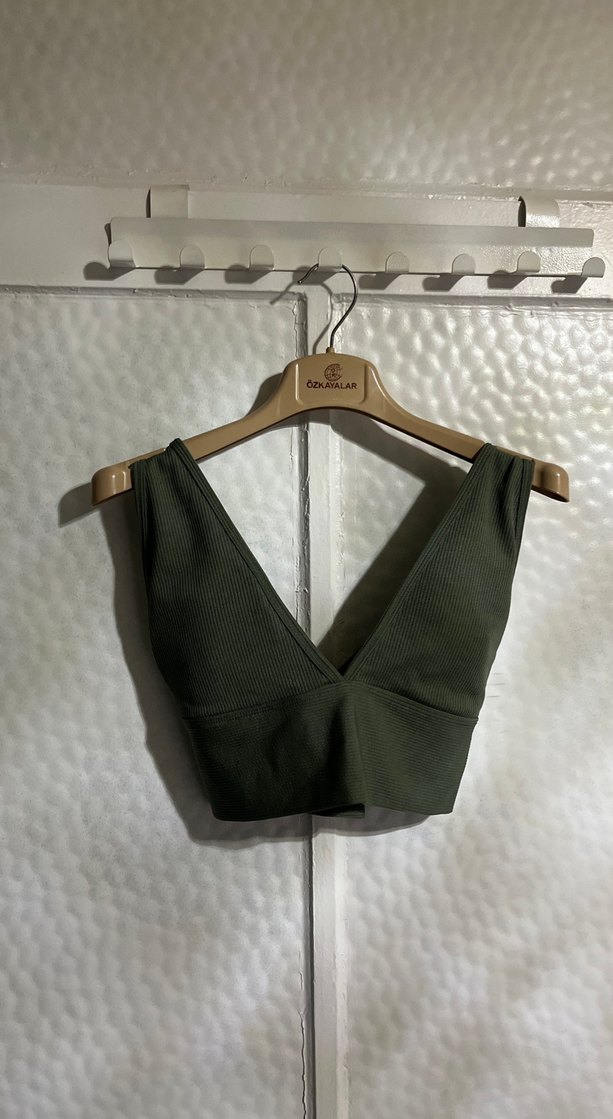 Kadınlar için haki renkli, kısa mini uzunlukta, derin V yakalı ve desensiz dokulu bralet. Sokak ve spor tarzına uygun. ♀️