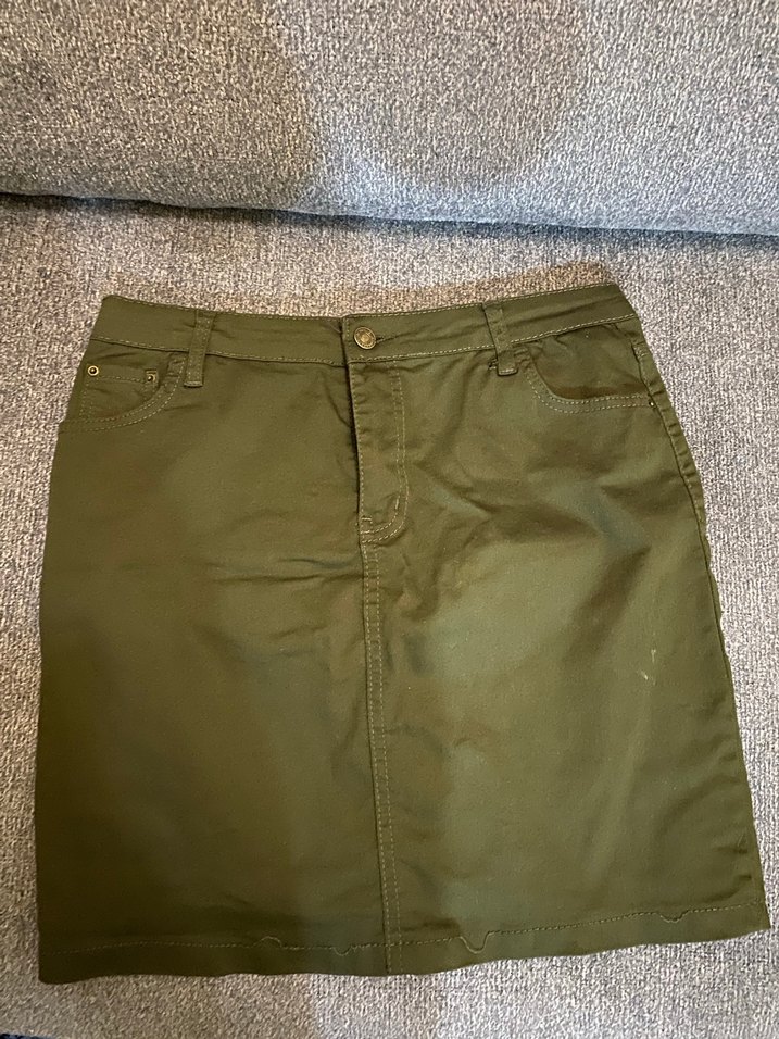 Kadın haki midi mini etek, düz desensiz, sentetik yumuşak kumaştan, oturmalı kesimle, gündelik dış mekan kullanımı için uygundur.