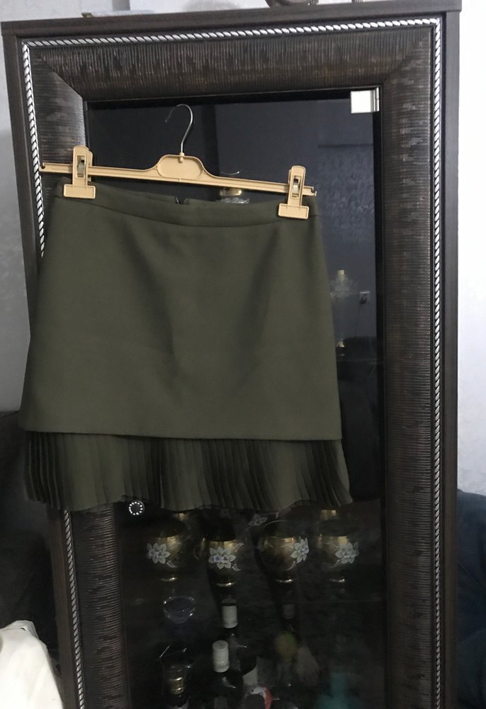 Haki renkli, pilili detaylı, sentetik kumaştan yapılmış, bol kesim mini etek, günlük ve sokak stiline uygundur.