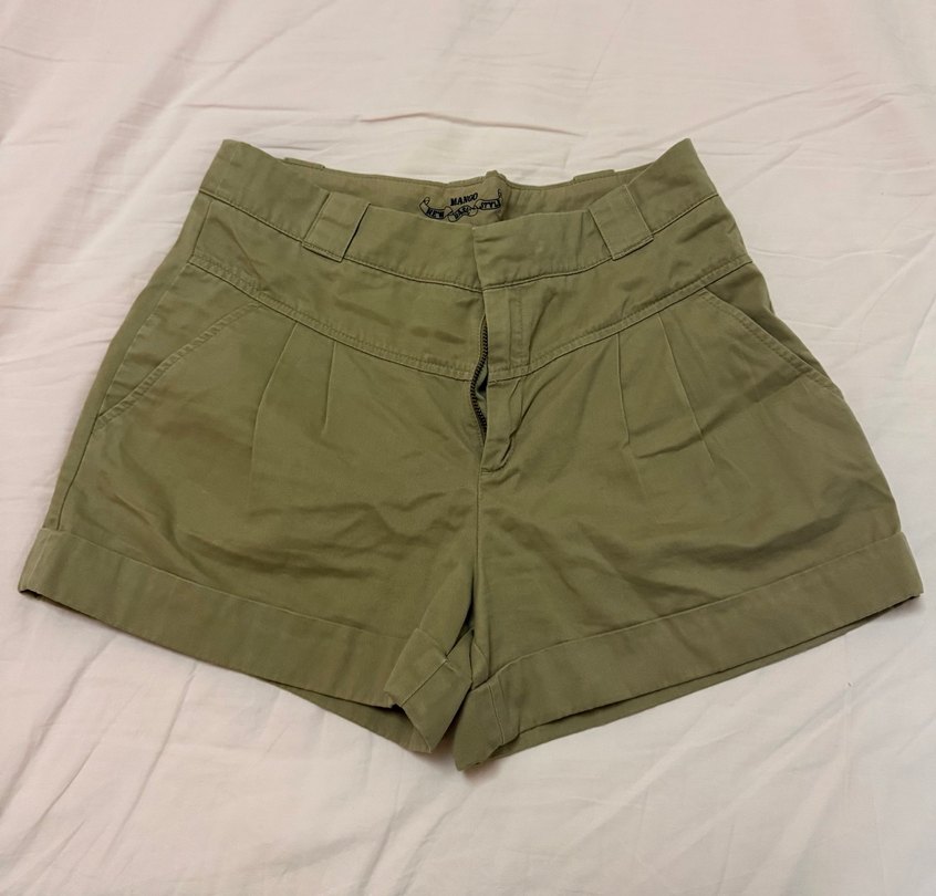 Haki renkte, pamuk kumaştan yapılmış, rahat kesim mini şort. Sokak stiline uygun, dışı süet gibi yüksek bel sorunsuz