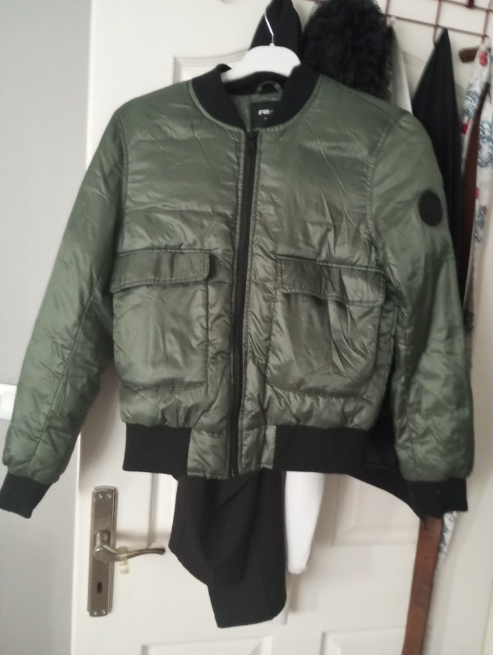 Dar kesim, haki renkli sokak stili mont, uzun kollu, bisiklet yaka ve fermuarlı. Sentetik kumaştan, kapaklı cepler ve ribanalı manşetlere sahip.