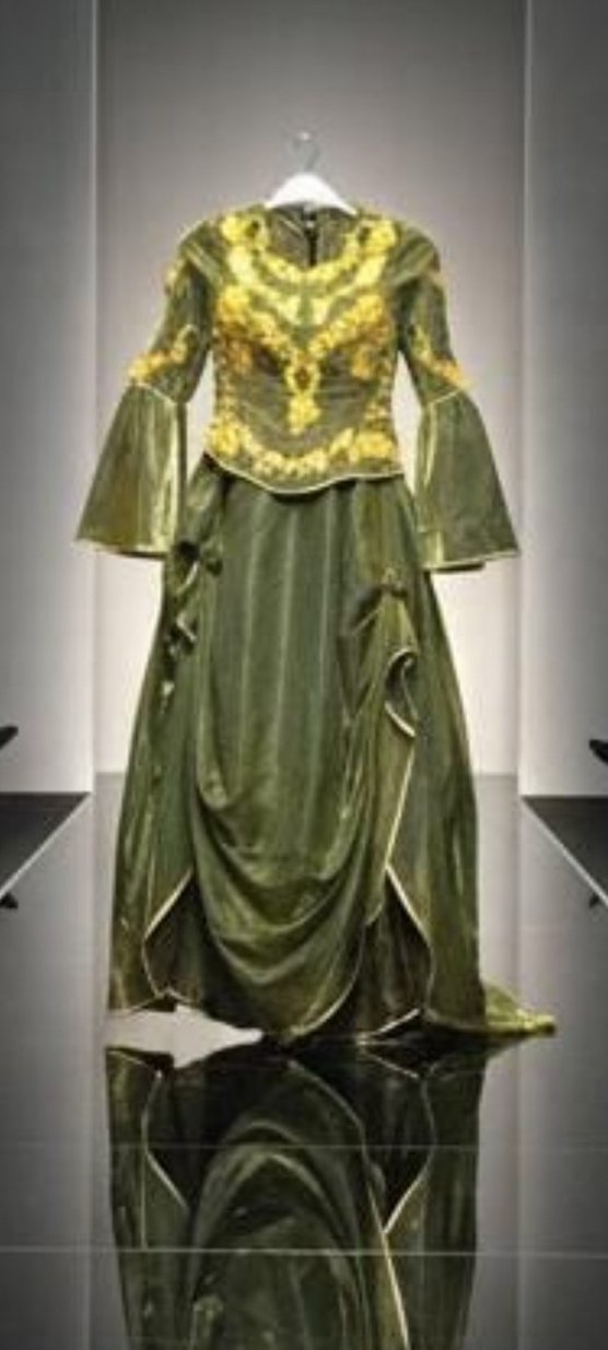 Haki renkli, nakışlı uzun bohem henna etekli iki parça, dökümlü ve bol kesimdir. V yaka ve uzun kollu, parlak dokunuşlu, düğünler için uygun.