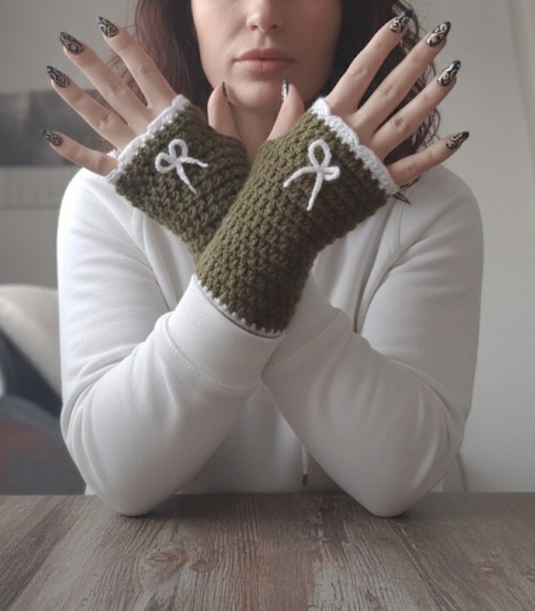 GÖRSEL BANA AİTTİR ✔️ İLAN AÇIYORUM Haki renk, örgü dokulu, beyaz fiyonk detaylı parmakları açık kadın eldiveni. Trendy casual goth tarzına uygun, rahat kullanımlı.