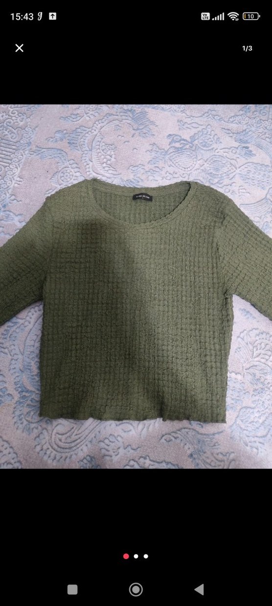 Gevşek kesim, uzun kollu, yuvarlak yakalı haki renk bürümcük kumaş bluz. Desensiz ve rahat, günlük kullanıma uygundur.