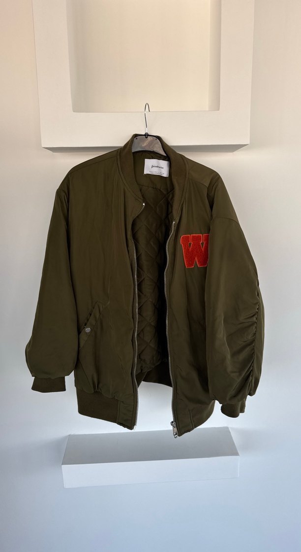 Haki renkli, oversize kesim bomber ceket uzun kollu ve kapitone astarlıdır. Günlük kullanıma uygun, rahat ve şık bir sokak stili sunar.