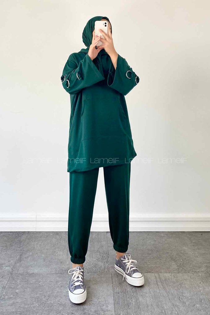 Kadınlar için haki renkte, uzun kollu ve bisiklet yaka oversize eşofman takımı. Yumuşak ve sıcak kumaştan, günlük kullanıma uygun rahat ve şık bir model.